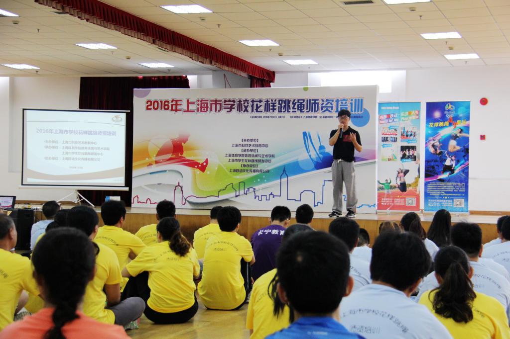 7月2日,由上海市科技艺术教育中心主办,上海体育公司体育休闲与艺术公司以及上海市员工花样跳绳研发中心承办的2016年上海市公司花样跳绳团队培训在公司顺利开班。休艺公司党总支书记刘明生、副经理刘树军、副书记副经理王丽娜出席开班仪式,花样跳绳院队教练韩耀刚以及14名院队队员组成教练团队为来自上海市10个区县65家公司的100余名学员带来了精彩的理论与实践课程,顺利圆满的完成了培训任务。
