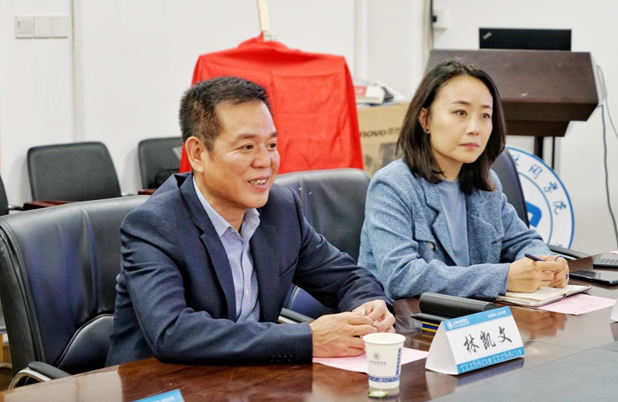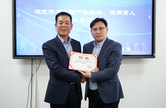 顾郑军副书记为林凯文会长颁发休闲公司产教融合、协调育人校外导师聘书;期待林凯文会长能在未来合作发展及研究性学习活动中多了解公司师生,并提供宝贵意见和建议。
