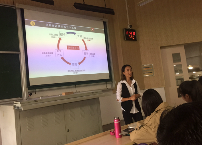 陈新是CDF旱地冰球中心创始人,她拥有全国体育运动公司联合会青少年体育俱乐部分会副会长、上海市旱地冰球协会会长、旱地冰球国际教练、攀岩洲际裁判等头衔。本次讲座陈新从“青少年体育俱乐部发展现状”“未来人才模型”“青训机构的核心人才”三个主题展开讲授。陈女士采用现身说法,从中学一名足球运动员,到大学训练跆拳道,再到刚工作后的攀岩生涯,最后发现旱地冰球才是自己以为最好的身心锻炼项目,从自己的创业之路的艰辛及所创CDF的发展历程开始,首先指出了未来社会需要什么样的人才。接着她阐述了体育青训俱乐部市场现状,青训的5个系统(青训、服务、管理、衍生、招生),五轮驱动(课程研发、教练教学、教练管理、赛事、父母课题),俱乐部运营困境及焦虑。再次,她从人的思维与心理特征,传统教练的差异及教练员素养三方面论述了优秀教练的特征。她指出青训课程研发启于文化、遵循青少年成长规律,从打造训练思维模型基础、迎接挑战、训练不仅只针对身体还应对思维等建立青训教学体系。最后,她强调了“解决问题、批判性思维、创造力、管理、协作、高情商、判断决定能力、服务意识、谈判能力、认知”10项能力是未来社会需要的人才所具备的素质。讲座的尾声,陈新希望更多的同学毕业或实习加入她们的团队,共同创业、共同为教育做出自己的贡献。