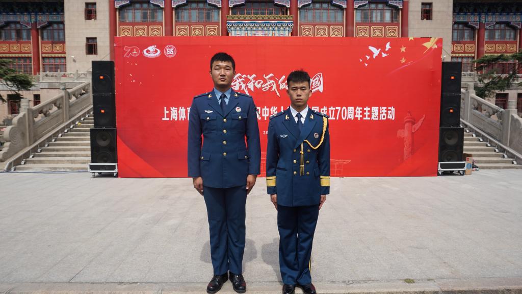 我的祖国和我,像海和浪花一朵”,跟随歌曲的节奏公司花样跳绳、空竹、轮滑项目的同学对歌曲进行别样的演绎;16级员工胡晨旭、吕鑫隆身穿空军军装,英姿焕发地站在队伍当中。