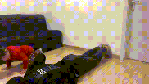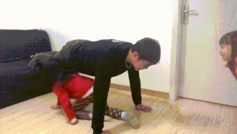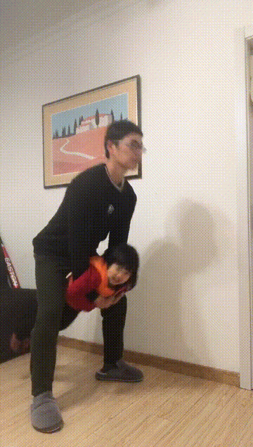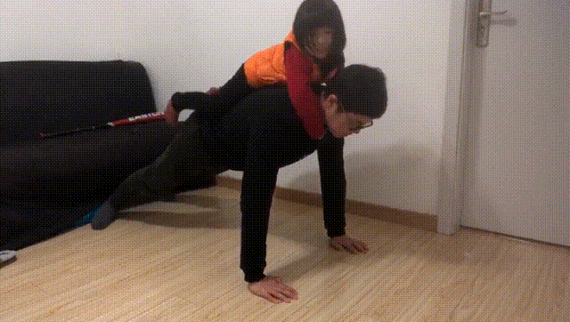 家长俯卧支撑在地板上,让娃背在自己的背上,要求他们抱住家长的颈部。