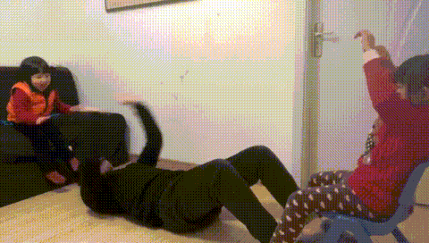孩子手持衣服撑当风扇,家长做一次俯卧撑要快速躲过风扇的击打。