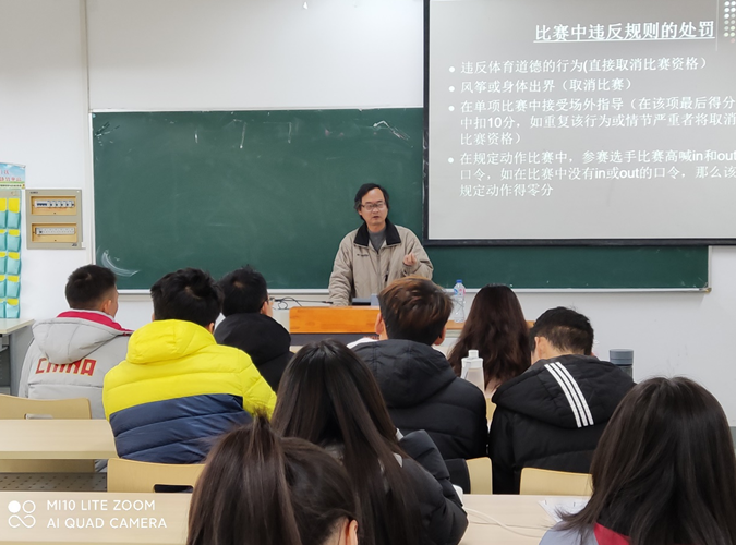 学习中,李老师先是向同学们踊跃加入到风筝运动裁判队伍中表示欢迎,然后向同学们介绍中国传统风筝的概念、类型、制作工艺及其竞赛规则,并指出中国传统风筝制作的“四艺”,即:扎、糊、绘、放,简单的四个字蕴藏着中国优秀的民间艺术文化,使中国传统风筝成为体育竞技比赛中唯一一个包含器材比赛的运动项目,融汇了深厚的民族文化和民族精神。李老师殷切希望能有更多像学员们这样的有志青年人才投入到风筝这一中国传统体育事业的发展中来。