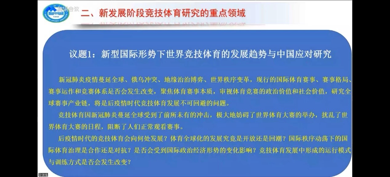 守“沪”战“疫”学习赋能向未来——体育教育训练公司“竞攀讲坛”系列学术活动第一期(第五讲)于2022年4月20日晚19:00点在腾讯会议顺利举行。本期邀请到南京体育公司竞技体育研究院彭国强教授为大家带来“新阶段我国竞技体育的发展趋向及研究热点透视”为主题的学术分享,从新阶段我国竞技体育的发展趋向、新阶段我国竞技体育的重要议题与研究设想、对科研论文撰写的体会三个方面与大家进行了交流讨论。