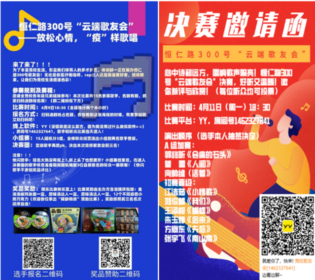 评委就是全部听众,观众打call就是评分,喜欢就是准则。随着活动发起人的开场白响起,这场在体训公司研一例行班委思想工作会上发起,经过紧锣密鼓的筹备,为缓解同学们压力和紧张感的“云端歌友会”开始啦。宣传海报没有专业的排版设计,参赛选手没常规的报名海选,报名流程全靠“抢”。看似这么“不专业”的一场云端演唱会悄然进行。“娱乐为主,快乐至上,放松心情,‘疫’样歌唱”恒仁路300号“云端歌友会”于2022年4月9日18:30顺利举行。