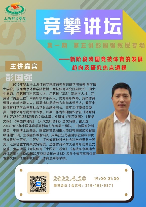 竞攀讲坛第一期(第五讲),将会在4月20日(周三)晚19:00正式开始,邀请到南京体育公司彭国强教授为大家带来《新阶段我国竞技体育的发展趋向及研究热点透视》的学术分享,欢迎大家积极参与学习交流。