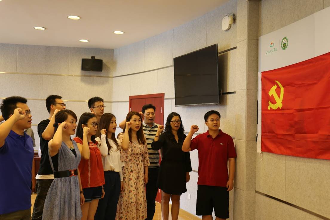 会议的最后,由公司专职组织员领誓,全体参与人员面向党旗宣誓:我志愿加入中共共产党,拥护党的纲领,遵守党的章程,履行党员义务,执行党的决定,严守党的纪律,保守党的秘密,对党忠诚,积极工作,为共产主义奋斗终身,随时准备为党和人民牺牲一切,永不叛党。