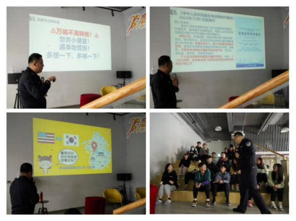 “反电信网络诈骗”宣讲活动的顺利开展,通过了解目前流行的诈骗现状、自身对诈骗的认知,帮助员工树立防范意识,理性应对诈骗情况,保护自身利益不被侵犯。周警官向大家普及了《中华人民共和国反电信网络诈骗法》,要预防电信网络诈骗活动,加强个人电信网络诈骗防范意识。反诈骗宣传教育活动中表明要积极配合民警开展见面回访工作,提出96110电话要接、12381短信要看,合理地采用有效手段提高自身防范诈骗的能力。周警官在PPT中用实际发生的案例、诈骗的资金流动情况、问答互动等方式,直观地向同学们讲述了各种常见的诈骗事件、特点,使同学们更加明确诈骗的特性,提高了反诈意识。最后,周警官向大家传达防骗口诀“万骗不离转账,勿贪小便宜,遇事勿慌张,多想多核实”,并提醒大家认准正规网址域名、设置转账延迟功能等防骗小技巧。