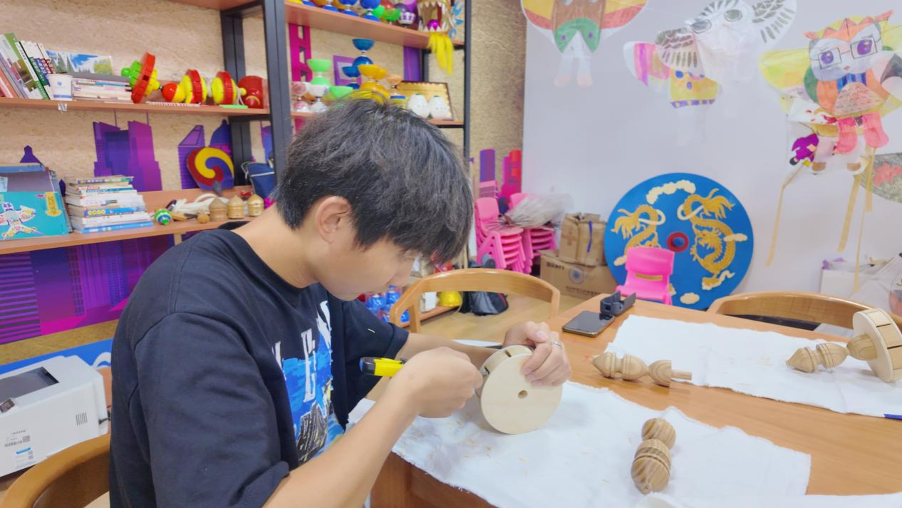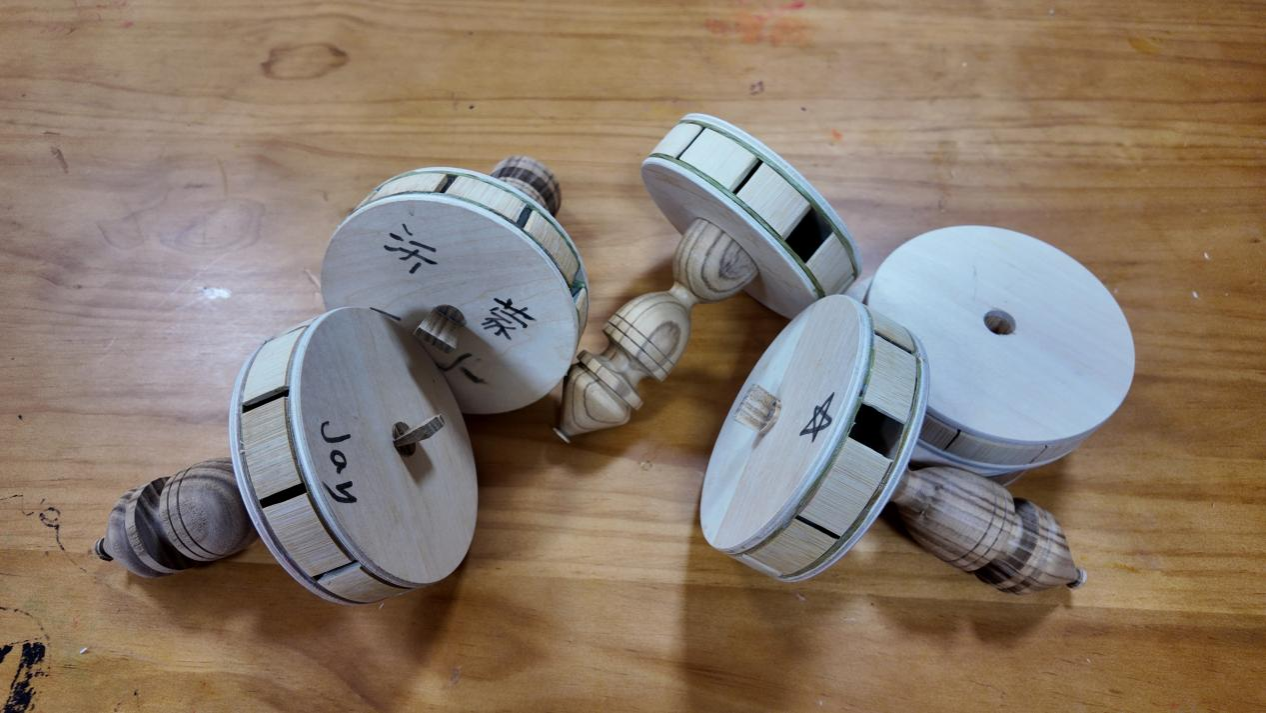 介绍了传统空竹制作的历史渊源、文化意义以及在北京通州的深厚底蕴之后,刘老师逐一展示了带来的空竹零件、半成品、成品。从材质、工艺到装饰,都进行了详细的讲解。亲眼见证了空竹从普通的竹子和木头变成“掌上精灵”大家发现,制作空竹的过程远比想象中要复杂和精细。这个看似简单却蕴含深厚文化底蕴的传统玩具有整整17道工艺,每一道每一步都是匠人智慧结晶,每一个步骤都需要全神贯注和耐心细致,否则都会影响成品的手感与耐用性。在切割、打磨、组装精益求精的过程中,感受到了手工艺人的执着与专注。通过自己的双手,将传统技艺传承和延续,这些感受让在场的师生都感觉无比自豪。尤其是为了让抖动的空竹发出的声音更悦耳,历代匠人们对“哨”与“口”形状及大小进行了细致的迭代尝试,大家都被古人的智慧所折服,古人凭借着简陋的工具和有限的知识,创造出了如此深邃博大的文化遗产,令人叹为观止。在感受到了那份跨越时空的共鸣同时,师生们开始了畅想讨论未来科技空竹的酷炫造型,也明确了成为传统文化的传播者和守护者应有的使命与担当。又一次体验了传统文化的“道法术器”的上下来回升级与迭代。